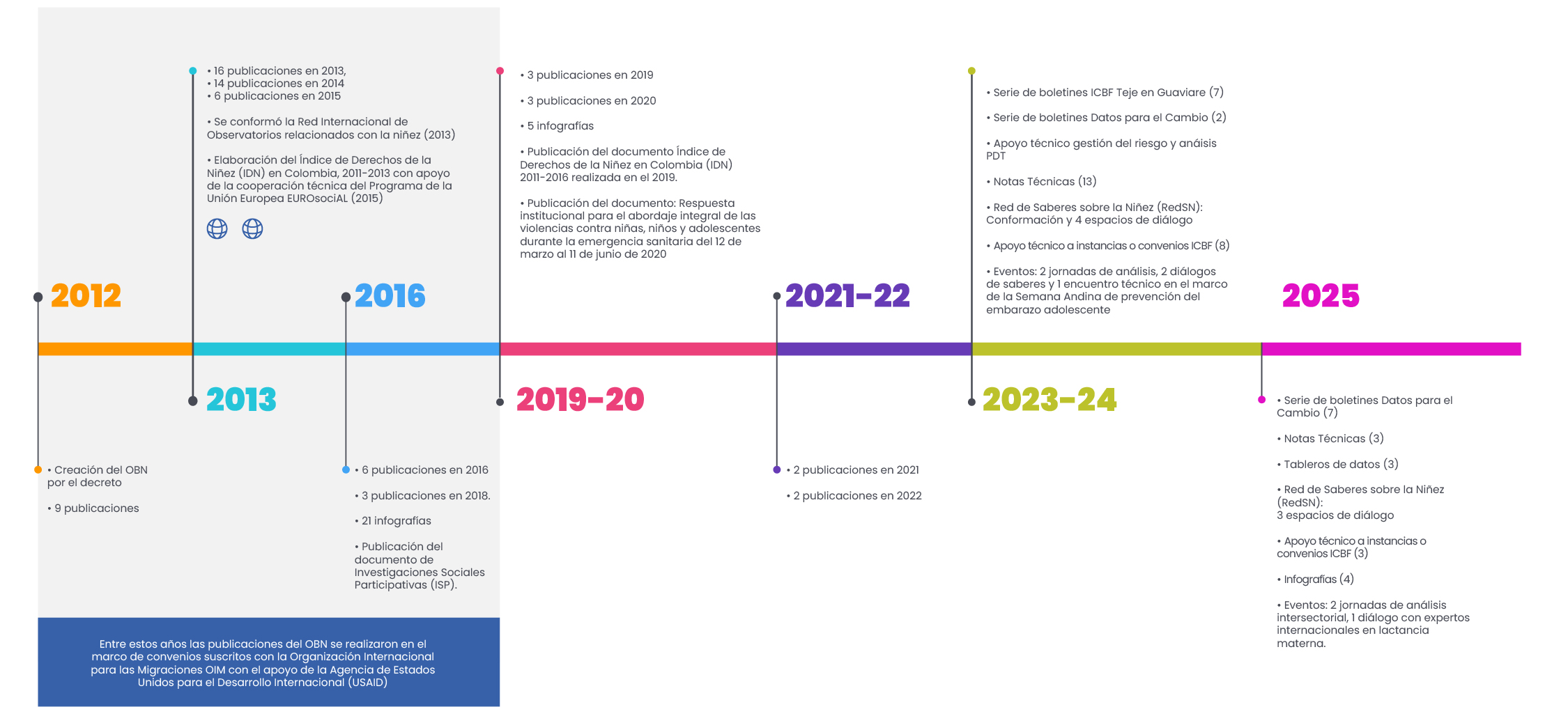 En el marco del compromiso asumido en el Plan Nacional de Desarrollo 2022–2026 Colombia Potencia Mundial de la Vida, el Sistema Nacional de Bienestar Familiar ha continuado avanzando durante 2024–2025 en el fortalecimiento, posicionamiento y renovación del OBN como una estrategia robusta de gestión del conocimiento. Esta labor se desarrolla en articulación con el portal Sistema Unificado de la Niñez (SUIN), con el propósito de producir, integrar y divulgar información oportuna y de calidad que oriente las decisiones y prioridades de acción de los agentes e instancias del SNBF.